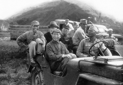 ▲毛泽东与赫尔利乘坐美军观察组的吉普车。