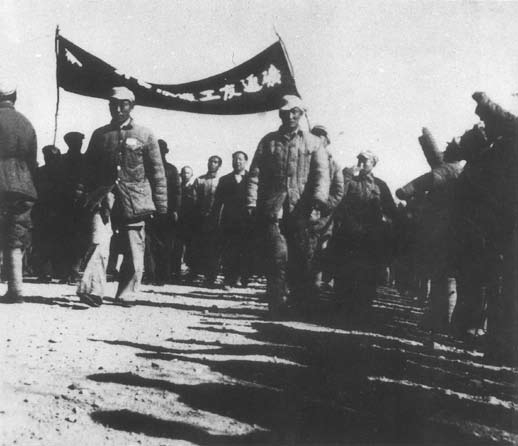 ●1949年,在解放军的强大攻势下,经过油矿员工的坚决斗争,玉门油矿完整无损地回到人民手中。这是时任玉门油矿军事总代表康世恩(左1)、军事副总代表焦力人(左2)接回被国民党关押的工人。