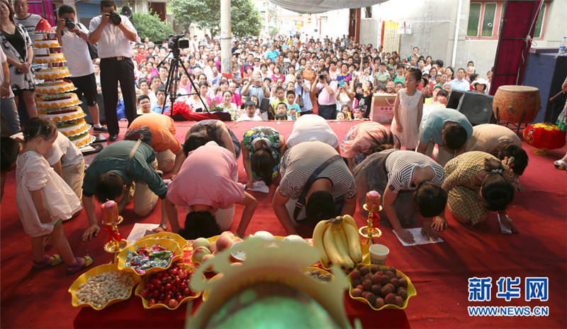 2015年6月7日,西安,王志恭老人百岁大寿,西安市城西皂河村全村人都来给他祝寿。王志恭生于1917年,17岁在国民革命军第38军教导队参加培训,参加过娘子关战役、中条山战役、河南巩县起义等重要战斗,后回家务农。孙辈们为王志恭老人叩头祝寿。
