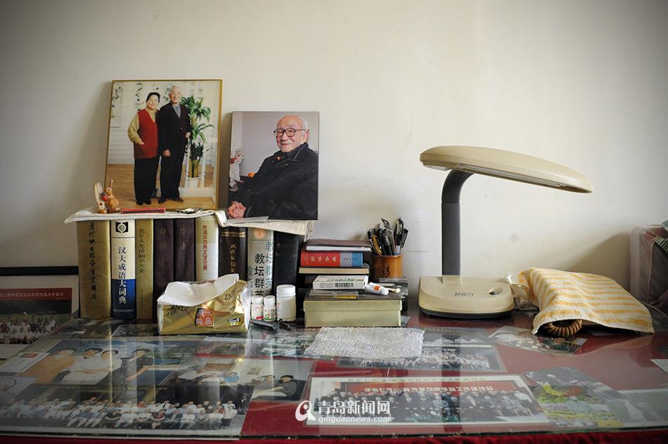图为王老的书桌上摆放着各种书籍和照片。“照片大多是我和学生们的合影,以前年轻时后的照片都找不到了。”他说(孙志文摄)