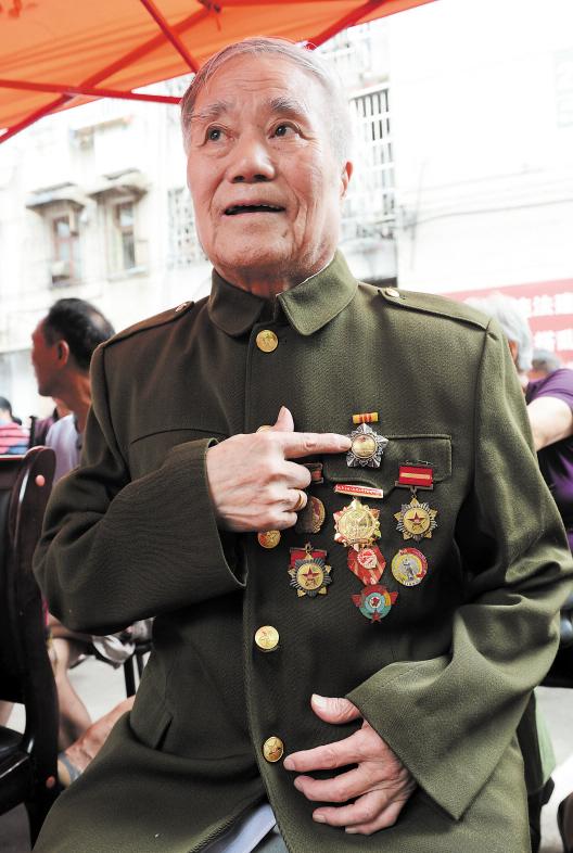 在现场,王老回忆,那天他走进授勋仪式的大礼堂后,主持人宣读了获奖勋章名单,大家并排立正,毛主席从台上走下来,微笑着拿起奖章,双手轻轻将三级解放勋章佩戴在他胸前,并与他及其他人员一一握手。“这是我一生最大的荣誉”。在王老昨日展示的勋章中,记者注意到,毛主席颁给的该银质勋章整体为五角星形,中间为天安门城楼,四周为象征太阳光芒的发散性光线。