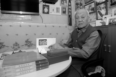老人95岁了,头发花白。他坐在桌前,低着头,不停翻看着记者带来的书。