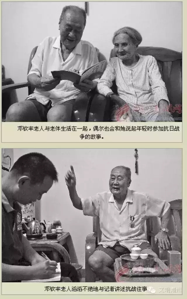 在潮州参加抗日战争的老兵中,邓钦丰算是年纪较小的一位。他1928年10月29日出生于市区北堤花窑边的一间老厝,13岁就参加地方抗日武装组织——潮澄饶抗日自卫总队,参与反抗日本侵略者的战争,并在日军投降时,随大队长吴超俊前往古巷镇深合村日军驻地,接管投降日军的武器装备,亲眼见证了日本侵略者从横行霸道、凶残无比到气数散尽、如“死狗”般的历史过程。