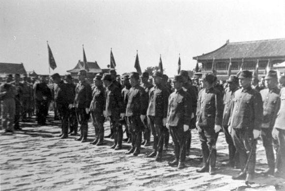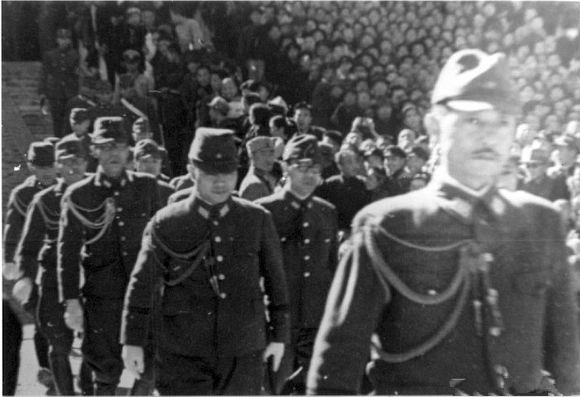 中国受降主官召日军投降代表华北方面军司令官根本博中将率领参谋长高桥坦以下廿一员幕僚入场