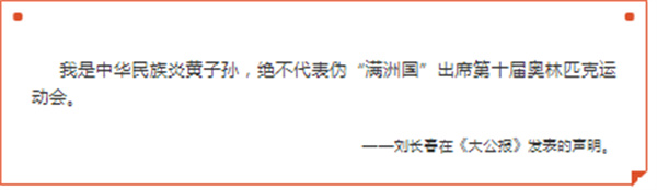 1932年,当时主管体育工作的国民政府教育部,以国难当头、时间匆忙、准备不足为由,拒绝中华体育协进会的要求,宣布不派遣运动员参加在洛杉矶举行的第10届奥运会,仅由全国体育协进会总干事沈嗣良前往观礼。但日本帝国主义为了骗取国际社会对伪“满洲国”的承认,竟然电告国际奥委会:拟派刘长春、于希渭作伪“满洲国”选手参加奥运会。此消息传开后,全国群情激奋。东北大学学生、短跑名将刘长春发表公开声明:绝不代表伪“满洲国”参加奥运会。其后,他在张学良的帮助下,作为代表中国政府派出的唯一一名运动员参加了奥运会。刘长春单刀赴会,实现了中国人参加奥运会的梦想。中国首次参加奥运会,不仅是中国体育走向世界、走向奥运圣坛的开始,而且也是中华民族自发的一场反对日本帝国主义阴谋分裂中国的政治斗争,是中国人民爱国情怀的充分显露。