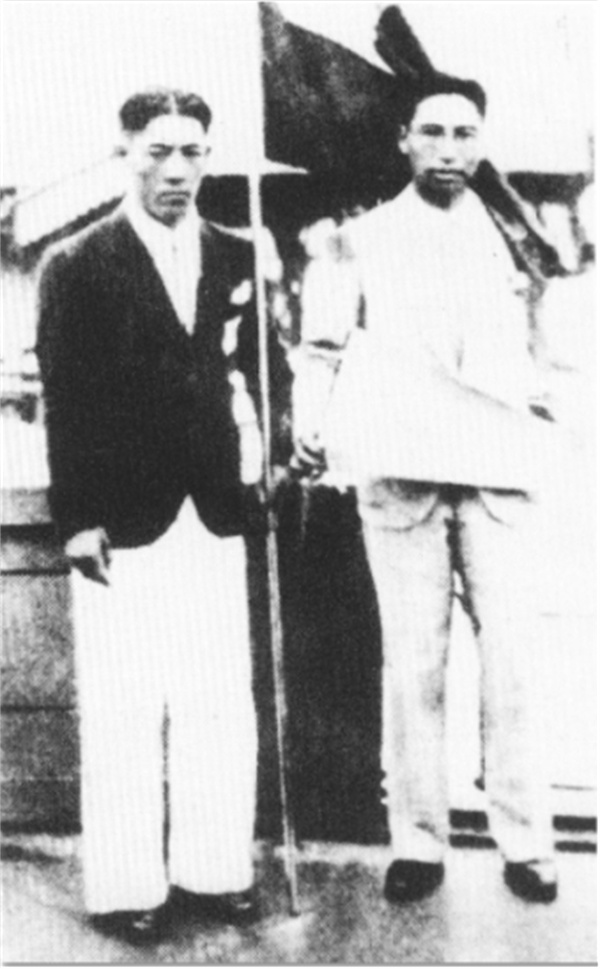 刘长春与教练兼翻译宋君复在上海新关码头合影。宋君复曾留学美国,是刘长春东北大学的老师。1936年,宋君复以田径队管理的身份参加了柏林奥运会。1948年,作为中国体育代表团的成员,参加了第14届伦敦奥运会。中华人民共和国成立后,宋君复任教于北京师范大学体育系。1953年赴北京体育学院工作,历任系主任、副院长等职。1964年,宋君复当选为中华全国体育总会第4届委员会委员,第4届全国政协委员。图为刘长春(左)与教练兼翻译宋君复。